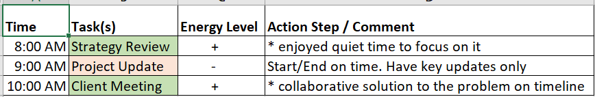 Step 2: Next mark your calendar as either red (energy draining), yellow (neural) or green (energizing). If you are writing this you can also mark it as (-), (=), (+) respectively. I like to change the color of the cell in excel where I wrote the task.